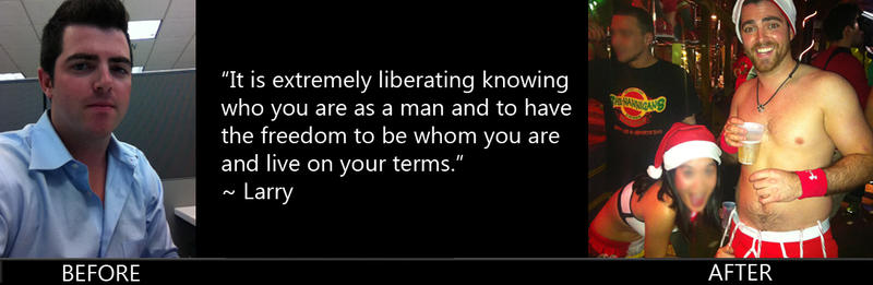 “I really didn't feel like anything could help me out of my feeling of hopelessness with women. But I decided to take you up on your challenge and try your program for thirty days. You were right! The changes are unf*ckingbelievable! My body, my voice, my attitude, my inner dialog, everything is different. I feel like a FUCKING MAN! My dating and sex life has improved in ways I never thought possible for me before. Thank you.” ~JM